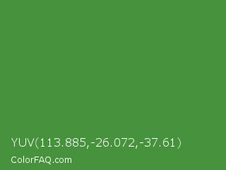 YUV 113.885,-26.072,-37.61 Color is a normal green color and the nearest color is May Green #4c9141. Hex code #47923d and RGB value is rgb(71,146,61). In RGB color space, this color is composed of 28% red, 57% green, 24% blue, In CMYK color space, this color is composed of 51% cyan, 0% magenta, 58% yellow , 43% black , In HSL color space, this color has a hue angle of 113° , 41% saturation and 41% lightness.