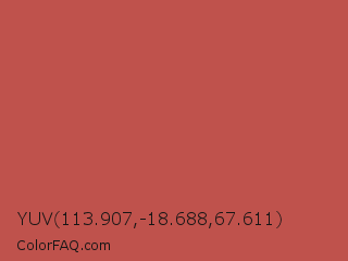 YUV 113.907,-18.688,67.611 Color is a normal red color and the nearest color is Bittersweet Shimmer #bf4f51. Hex code #bf524c and RGB value is rgb(191,82,76). In RGB color space, this color is composed of 75% red, 32% green, 30% blue, In CMYK color space, this color is composed of 0% cyan, 57% magenta, 60% yellow , 25% black , In HSL color space, this color has a hue angle of 3° , 47% saturation and 52% lightness.