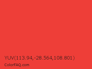 YUV 113.94,-28.564,108.801 Color is a normal red color and the nearest color is Cinnabar #e34234. Hex code #ee3e38 and RGB value is rgb(238,62,56). In RGB color space, this color is composed of 93% red, 24% green, 22% blue, In CMYK color space, this color is composed of 0% cyan, 74% magenta, 76% yellow , 7% black , In HSL color space, this color has a hue angle of 2° , 84% saturation and 58% lightness.