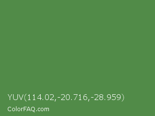YUV 114.02,-20.716,-28.959 Color is a normal green color and the nearest color is Hippie Green #53824b. Hex code #518b48 and RGB value is rgb(81,139,72). In RGB color space, this color is composed of 32% red, 55% green, 28% blue, In CMYK color space, this color is composed of 42% cyan, 0% magenta, 48% yellow , 45% black , In HSL color space, this color has a hue angle of 112° , 32% saturation and 41% lightness.