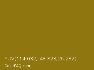 YUV 114.032,-48.823,26.282 Color is a normal yellow color and the nearest color is Sand Dune #967117. Hex code #90760f and RGB value is rgb(144,118,15). In RGB color space, this color is composed of 56% red, 46% green, 6% blue, In CMYK color space, this color is composed of 0% cyan, 18% magenta, 90% yellow , 44% black , In HSL color space, this color has a hue angle of 48° , 81% saturation and 31% lightness.