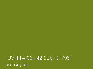 YUV 114.05,-42.916,-1.798 Color is a normal lime color and the nearest color is Pacifika #778120. Hex code #70841b and RGB value is rgb(112,132,27). In RGB color space, this color is composed of 44% red, 52% green, 11% blue, In CMYK color space, this color is composed of 15% cyan, 0% magenta, 80% yellow , 48% black , In HSL color space, this color has a hue angle of 71° , 66% saturation and 31% lightness.