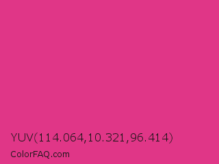 YUV 114.064,10.321,96.414 Color is a normal rose color and the nearest color is Cerise #da3287. Hex code #e03687 and RGB value is rgb(224,54,135). In RGB color space, this color is composed of 88% red, 21% green, 53% blue, In CMYK color space, this color is composed of 0% cyan, 76% magenta, 40% yellow , 12% black , In HSL color space, this color has a hue angle of 331° , 73% saturation and 55% lightness.