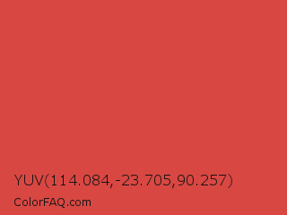 YUV 114.084,-23.705,90.257 Color is a normal red color and the nearest color is Valencia #d84437. Hex code #d94742 and RGB value is rgb(217,71,66). In RGB color space, this color is composed of 85% red, 28% green, 26% blue, In CMYK color space, this color is composed of 0% cyan, 67% magenta, 70% yellow , 15% black , In HSL color space, this color has a hue angle of 2° , 67% saturation and 55% lightness.