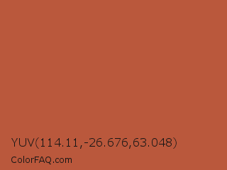 YUV 114.11,-26.676,63.048 Color is a normal red color and the nearest color is Crail #b95140. Hex code #ba583c and RGB value is rgb(186,88,60). In RGB color space, this color is composed of 73% red, 35% green, 24% blue, In CMYK color space, this color is composed of 0% cyan, 53% magenta, 68% yellow , 27% black , In HSL color space, this color has a hue angle of 13° , 51% saturation and 48% lightness.
