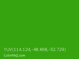 YUV 114.124,-48.868,-52.729 Color is a normal green color and the nearest color is Slimy Green #299617. Hex code #36a40f and RGB value is rgb(54,164,15). In RGB color space, this color is composed of 21% red, 64% green, 6% blue, In CMYK color space, this color is composed of 67% cyan, 0% magenta, 91% yellow , 36% black , In HSL color space, this color has a hue angle of 104° , 83% saturation and 35% lightness.