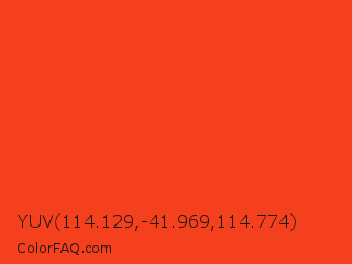 YUV 114.129,-41.969,114.774 Color is a normal red color and the nearest color is Pomegranate #f34723. Hex code #f5401d and RGB value is rgb(245,64,29). In RGB color space, this color is composed of 96% red, 25% green, 11% blue, In CMYK color space, this color is composed of 0% cyan, 74% magenta, 88% yellow , 4% black , In HSL color space, this color has a hue angle of 10° , 92% saturation and 54% lightness.