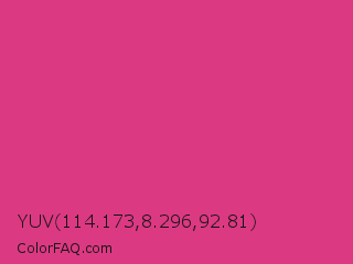 YUV 114.173,8.296,92.81 Color is a normal rose color and the nearest color is Cerise #da3287. Hex code #dc3983 and RGB value is rgb(220,57,131). In RGB color space, this color is composed of 86% red, 22% green, 51% blue, In CMYK color space, this color is composed of 0% cyan, 74% magenta, 40% yellow , 14% black , In HSL color space, this color has a hue angle of 333° , 70% saturation and 54% lightness.
