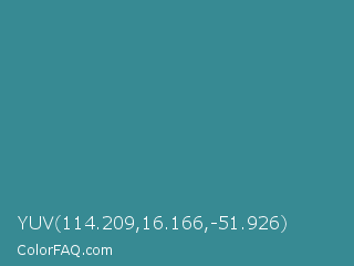YUV 114.209,16.166,-51.926 Color is a normal cyan color and the nearest color is Lochinvar #2c8c84. Hex code #378a93 and RGB value is rgb(55,138,147). In RGB color space, this color is composed of 22% red, 54% green, 58% blue, In CMYK color space, this color is composed of 63% cyan, 6% magenta, 0% yellow , 42% black , In HSL color space, this color has a hue angle of 186° , 46% saturation and 40% lightness.
