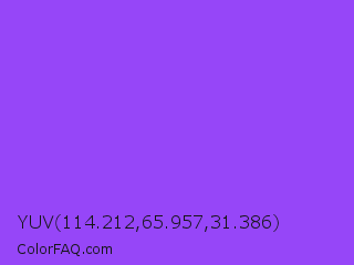 YUV 114.212,65.957,31.386 Color is a light violet color and the nearest color is Navy Purple #9457eb. Hex code #9646f8 and RGB value is rgb(150,70,248). In RGB color space, this color is composed of 59% red, 27% green, 97% blue, In CMYK color space, this color is composed of 40% cyan, 72% magenta, 0% yellow , 3% black , In HSL color space, this color has a hue angle of 267° , 93% saturation and 62% lightness.
