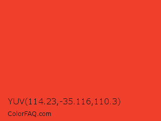 YUV 114.23,-35.116,110.3 Color is a normal red color and the nearest color is Pomegranate #f34723. Hex code #f0402b and RGB value is rgb(240,64,43). In RGB color space, this color is composed of 94% red, 25% green, 17% blue, In CMYK color space, this color is composed of 0% cyan, 73% magenta, 82% yellow , 6% black , In HSL color space, this color has a hue angle of 6° , 87% saturation and 55% lightness.