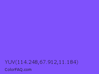 YUV 114.248,67.912,11.184 Color is a light indigo color and the nearest color is Medium Slate Blue #7b68ee. Hex code #7f51fc and RGB value is rgb(127,81,252). In RGB color space, this color is composed of 50% red, 32% green, 99% blue, In CMYK color space, this color is composed of 50% cyan, 68% magenta, 0% yellow , 1% black , In HSL color space, this color has a hue angle of 256° , 97% saturation and 65% lightness.