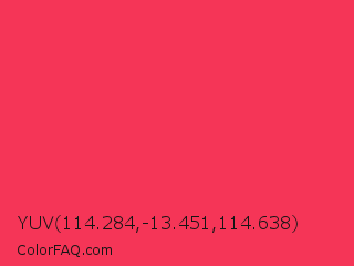 YUV 114.284,-13.451,114.638 Color is a normal red color and the nearest color is Sizzling Red #ff3855. Hex code #f53557 and RGB value is rgb(245,53,87). In RGB color space, this color is composed of 96% red, 21% green, 34% blue, In CMYK color space, this color is composed of 0% cyan, 78% magenta, 64% yellow , 4% black , In HSL color space, this color has a hue angle of 349° , 91% saturation and 58% lightness.