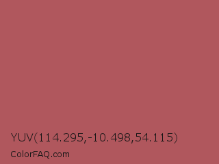 YUV 114.295,-10.498,54.115 Color is a normal red color and the nearest color is Matrix #b05d54. Hex code #b0575d and RGB value is rgb(176,87,93). In RGB color space, this color is composed of 69% red, 34% green, 36% blue, In CMYK color space, this color is composed of 0% cyan, 51% magenta, 47% yellow , 31% black , In HSL color space, this color has a hue angle of 356° , 36% saturation and 52% lightness.