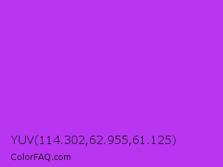 YUV 114.302,62.955,61.125 Color is a normal purple color and the nearest color is Veronica #a020f0. Hex code #b836f2 and RGB value is rgb(184,54,242). In RGB color space, this color is composed of 72% red, 21% green, 95% blue, In CMYK color space, this color is composed of 24% cyan, 78% magenta, 0% yellow , 5% black , In HSL color space, this color has a hue angle of 281° , 88% saturation and 58% lightness.
