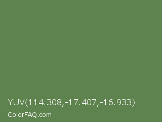 YUV 114.308,-17.407,-16.933 Color is a normal green color and the nearest color is Hippie Green #53824b. Hex code #5f834f and RGB value is rgb(95,131,79). In RGB color space, this color is composed of 37% red, 51% green, 31% blue, In CMYK color space, this color is composed of 27% cyan, 0% magenta, 40% yellow , 49% black , In HSL color space, this color has a hue angle of 102° , 25% saturation and 41% lightness.