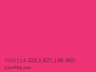 YUV 114.323,0.827,108.465 Color is a normal rose color and the nearest color is Cerise Pink #ec3b83. Hex code #ee3374 and RGB value is rgb(238,51,116). In RGB color space, this color is composed of 93% red, 20% green, 45% blue, In CMYK color space, this color is composed of 0% cyan, 79% magenta, 51% yellow , 7% black , In HSL color space, this color has a hue angle of 339° , 85% saturation and 57% lightness.