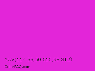 YUV 114.33,50.616,98.812 Color is a normal magenta color and the nearest color is Steel Pink #cc33cc. Hex code #e325d9 and RGB value is rgb(227,37,217). In RGB color space, this color is composed of 89% red, 15% green, 85% blue, In CMYK color space, this color is composed of 0% cyan, 84% magenta, 4% yellow , 11% black , In HSL color space, this color has a hue angle of 303° , 77% saturation and 52% lightness.