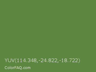 YUV 114.348,-24.822,-18.722 Color is a normal green color and the nearest color is Hippie Green #53824b. Hex code #5d8740 and RGB value is rgb(93,135,64). In RGB color space, this color is composed of 36% red, 53% green, 25% blue, In CMYK color space, this color is composed of 31% cyan, 0% magenta, 53% yellow , 47% black , In HSL color space, this color has a hue angle of 95° , 36% saturation and 39% lightness.