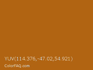 YUV 114.376,-47.02,54.921 Color is a normal orange color and the nearest color is Pumpkin Skin #b1610b. Hex code #b16513 and RGB value is rgb(177,101,19). In RGB color space, this color is composed of 69% red, 40% green, 7% blue, In CMYK color space, this color is composed of 0% cyan, 43% magenta, 89% yellow , 31% black , In HSL color space, this color has a hue angle of 31° , 81% saturation and 38% lightness.
