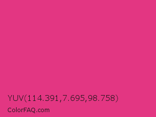 YUV 114.391,7.695,98.758 Color is a normal rose color and the nearest color is Cerise Pink #ec3b83. Hex code #e33682 and RGB value is rgb(227,54,130). In RGB color space, this color is composed of 89% red, 21% green, 51% blue, In CMYK color space, this color is composed of 0% cyan, 76% magenta, 43% yellow , 11% black , In HSL color space, this color has a hue angle of 334° , 76% saturation and 55% lightness.
