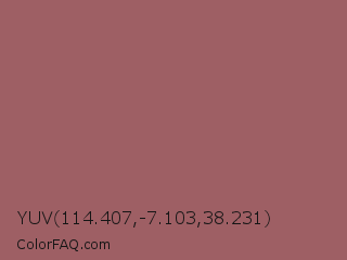 YUV 114.407,-7.103,38.231 Color is a normal red color and the nearest color is Copper Rose #996666. Hex code #9e5f64 and RGB value is rgb(158,95,100). In RGB color space, this color is composed of 62% red, 37% green, 39% blue, In CMYK color space, this color is composed of 0% cyan, 40% magenta, 37% yellow , 38% black , In HSL color space, this color has a hue angle of 355° , 25% saturation and 50% lightness.