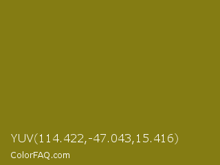 YUV 114.422,-47.043,15.416 Color is a dark yellow color and the nearest color is Trendy Green #7c881a. Hex code #847c13 and RGB value is rgb(132,124,19). In RGB color space, this color is composed of 52% red, 49% green, 7% blue, In CMYK color space, this color is composed of 0% cyan, 6% magenta, 86% yellow , 48% black , In HSL color space, this color has a hue angle of 56° , 75% saturation and 30% lightness.
