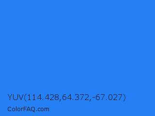 YUV 114.428,64.372,-67.027 Color is a normal blue color and the nearest color is Blue Crayola #1f75fe. Hex code #2680f5 and RGB value is rgb(38,128,245). In RGB color space, this color is composed of 15% red, 50% green, 96% blue, In CMYK color space, this color is composed of 84% cyan, 48% magenta, 0% yellow , 4% black , In HSL color space, this color has a hue angle of 214° , 91% saturation and 55% lightness.