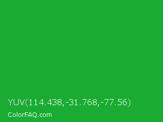 YUV 114.438,-31.768,-77.56 Color is a normal green color and the nearest color is Wageningen Green #34b233. Hex code #1aac32 and RGB value is rgb(26,172,50). In RGB color space, this color is composed of 10% red, 67% green, 20% blue, In CMYK color space, this color is composed of 85% cyan, 0% magenta, 71% yellow , 33% black , In HSL color space, this color has a hue angle of 130° , 74% saturation and 39% lightness.