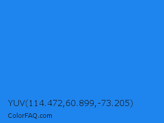 YUV 114.472,60.899,-73.205 Color is a normal blue color and the nearest color is Dodger Blue #1e90ff. Hex code #1f85ee and RGB value is rgb(31,133,238). In RGB color space, this color is composed of 12% red, 52% green, 93% blue, In CMYK color space, this color is composed of 87% cyan, 44% magenta, 0% yellow , 7% black , In HSL color space, this color has a hue angle of 210° , 86% saturation and 53% lightness.