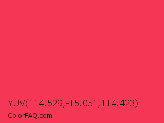 YUV 114.529,-15.051,114.423 Color is a normal red color and the nearest color is Sizzling Red #ff3855. Hex code #f53654 and RGB value is rgb(245,54,84). In RGB color space, this color is composed of 96% red, 21% green, 33% blue, In CMYK color space, this color is composed of 0% cyan, 78% magenta, 66% yellow , 4% black , In HSL color space, this color has a hue angle of 351° , 91% saturation and 59% lightness.