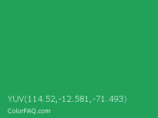 YUV 114.52,-12.581,-71.493 Color is a normal green color and the nearest color is Eucalyptus #278a5b. Hex code #21a159 and RGB value is rgb(33,161,89). In RGB color space, this color is composed of 13% red, 63% green, 35% blue, In CMYK color space, this color is composed of 80% cyan, 0% magenta, 45% yellow , 37% black , In HSL color space, this color has a hue angle of 146° , 66% saturation and 38% lightness.