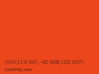 YUV 114.547,-42.668,105.637 Color is a normal red color and the nearest color is Pomegranate #f34723. Hex code #eb461c and RGB value is rgb(235,70,28). In RGB color space, this color is composed of 92% red, 27% green, 11% blue, In CMYK color space, this color is composed of 0% cyan, 70% magenta, 88% yellow , 8% black , In HSL color space, this color has a hue angle of 12° , 84% saturation and 52% lightness.