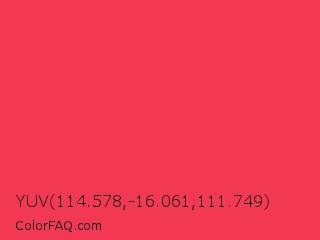 YUV 114.578,-16.061,111.749 Color is a normal red color and the nearest color is Desire #ea3c53. Hex code #f23852 and RGB value is rgb(242,56,82). In RGB color space, this color is composed of 95% red, 22% green, 32% blue, In CMYK color space, this color is composed of 0% cyan, 77% magenta, 66% yellow , 5% black , In HSL color space, this color has a hue angle of 352° , 88% saturation and 58% lightness.