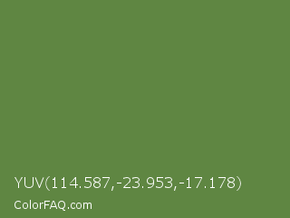YUV 114.587,-23.953,-17.178 Color is a normal green color and the nearest color is Hippie Green #53824b. Hex code #5f8642 and RGB value is rgb(95,134,66). In RGB color space, this color is composed of 37% red, 53% green, 26% blue, In CMYK color space, this color is composed of 29% cyan, 0% magenta, 51% yellow , 47% black , In HSL color space, this color has a hue angle of 94° , 34% saturation and 39% lightness.