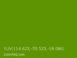 YUV 114.623,-55.523,-18.086 Color is a dark green color and the nearest color is Avocado #568203. Hex code #5e9302 and RGB value is rgb(94,147,2). In RGB color space, this color is composed of 37% red, 58% green, 1% blue, In CMYK color space, this color is composed of 36% cyan, 0% magenta, 99% yellow , 42% black , In HSL color space, this color has a hue angle of 82° , 97% saturation and 29% lightness.