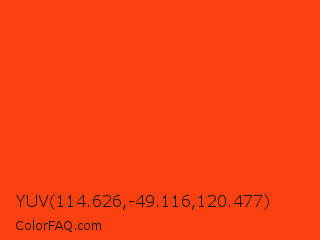 YUV 114.626,-49.116,120.477 Color is a normal red color and the nearest color is Orioles Orange #fb4f14. Hex code #fc400f and RGB value is rgb(252,64,15). In RGB color space, this color is composed of 99% red, 25% green, 6% blue, In CMYK color space, this color is composed of 0% cyan, 75% magenta, 94% yellow , 1% black , In HSL color space, this color has a hue angle of 12° , 98% saturation and 52% lightness.