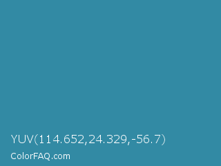 YUV 114.652,24.329,-56.7 Color is a normal blue color and the nearest color is Astral #327da0. Hex code #328aa4 and RGB value is rgb(50,138,164). In RGB color space, this color is composed of 20% red, 54% green, 64% blue, In CMYK color space, this color is composed of 70% cyan, 16% magenta, 0% yellow , 36% black , In HSL color space, this color has a hue angle of 194° , 53% saturation and 42% lightness.