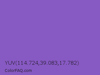 YUV 114.724,39.083,17.782 Color is a normal violet color and the nearest color is Fuchsia Blue #7a58c1. Hex code #8759c2 and RGB value is rgb(135,89,194). In RGB color space, this color is composed of 53% red, 35% green, 76% blue, In CMYK color space, this color is composed of 30% cyan, 54% magenta, 0% yellow , 24% black , In HSL color space, this color has a hue angle of 266° , 46% saturation and 55% lightness.