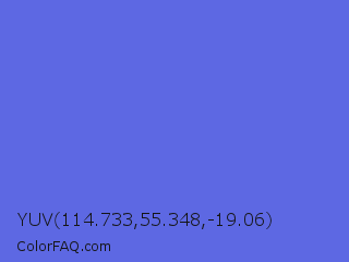 YUV 114.733,55.348,-19.06 Color is a light blue color and the nearest color is Majorelle Blue #6050dc. Hex code #5d68e3 and RGB value is rgb(93,104,227). In RGB color space, this color is composed of 36% red, 41% green, 89% blue, In CMYK color space, this color is composed of 59% cyan, 54% magenta, 0% yellow , 11% black , In HSL color space, this color has a hue angle of 235° , 71% saturation and 63% lightness.