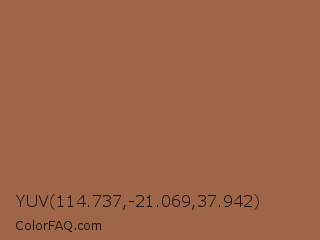 YUV 114.737,-21.069,37.942 Color is a normal orange color and the nearest color is Cape Palliser #a26645. Hex code #9e6548 and RGB value is rgb(158,101,72). In RGB color space, this color is composed of 62% red, 40% green, 28% blue, In CMYK color space, this color is composed of 0% cyan, 36% magenta, 54% yellow , 38% black , In HSL color space, this color has a hue angle of 20° , 37% saturation and 45% lightness.