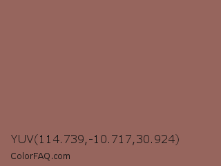 YUV 114.739,-10.717,30.924 Color is a normal red color and the nearest color is Au Chico #97605d. Hex code #96655d and RGB value is rgb(150,101,93). In RGB color space, this color is composed of 59% red, 40% green, 36% blue, In CMYK color space, this color is composed of 0% cyan, 33% magenta, 38% yellow , 41% black , In HSL color space, this color has a hue angle of 8° , 23% saturation and 48% lightness.