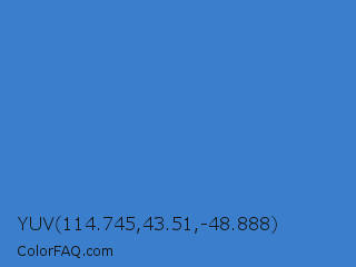 YUV 114.745,43.51,-48.888 Color is a normal blue color and the nearest color is Cyan Blue Azure #4682bf. Hex code #3b7ecb and RGB value is rgb(59,126,203). In RGB color space, this color is composed of 23% red, 49% green, 80% blue, In CMYK color space, this color is composed of 71% cyan, 38% magenta, 0% yellow , 20% black , In HSL color space, this color has a hue angle of 212° , 58% saturation and 51% lightness.