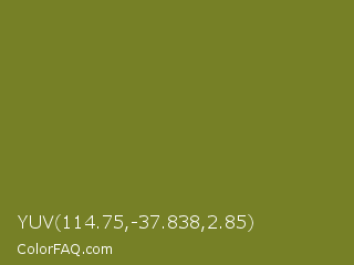 YUV 114.75,-37.838,2.85 Color is a normal yellow color and the nearest color is Pacifika #778120. Hex code #768026 and RGB value is rgb(118,128,38). In RGB color space, this color is composed of 46% red, 50% green, 15% blue, In CMYK color space, this color is composed of 8% cyan, 0% magenta, 70% yellow , 50% black , In HSL color space, this color has a hue angle of 67° , 54% saturation and 33% lightness.