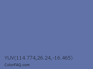 YUV 114.774,26.24,-16.465 Color is a normal blue color and the nearest color is Waikawa Gray #5a6e9c. Hex code #6072a8 and RGB value is rgb(96,114,168). In RGB color space, this color is composed of 38% red, 45% green, 66% blue, In CMYK color space, this color is composed of 43% cyan, 32% magenta, 0% yellow , 34% black , In HSL color space, this color has a hue angle of 225° , 29% saturation and 52% lightness.