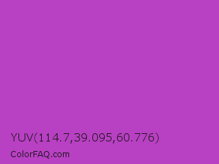 YUV 114.7,39.095,60.776 Color is a normal magenta color and the nearest color is Fuchsia Pink #c154c1. Hex code #b840c2 and RGB value is rgb(184,64,194). In RGB color space, this color is composed of 72% red, 25% green, 76% blue, In CMYK color space, this color is composed of 5% cyan, 67% magenta, 0% yellow , 24% black , In HSL color space, this color has a hue angle of 295° , 52% saturation and 51% lightness.