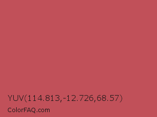 YUV 114.813,-12.726,68.57 Color is a normal red color and the nearest color is Fuzzy Wuzzy Brown #c45655. Hex code #c15059 and RGB value is rgb(193,80,89). In RGB color space, this color is composed of 76% red, 31% green, 35% blue, In CMYK color space, this color is composed of 0% cyan, 59% magenta, 54% yellow , 24% black , In HSL color space, this color has a hue angle of 355° , 48% saturation and 54% lightness.