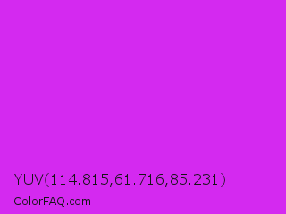 YUV 114.815,61.716,85.231 Color is a normal magenta color and the nearest color is Steel Pink #cc33cc. Hex code #d429f0 and RGB value is rgb(212,41,240). In RGB color space, this color is composed of 83% red, 16% green, 94% blue, In CMYK color space, this color is composed of 12% cyan, 83% magenta, 0% yellow , 6% black , In HSL color space, this color has a hue angle of 292° , 87% saturation and 55% lightness.