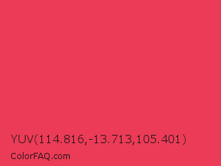YUV 114.816,-13.713,105.401 Color is a normal red color and the nearest color is Desire #ea3c53. Hex code #eb3b57 and RGB value is rgb(235,59,87). In RGB color space, this color is composed of 92% red, 23% green, 34% blue, In CMYK color space, this color is composed of 0% cyan, 75% magenta, 63% yellow , 8% black , In HSL color space, this color has a hue angle of 350° , 81% saturation and 58% lightness.