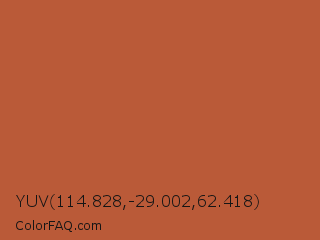 YUV 114.828,-29.002,62.418 Color is a normal orange color and the nearest color is Tuscany #bd5e2e. Hex code #ba5a38 and RGB value is rgb(186,90,56). In RGB color space, this color is composed of 73% red, 35% green, 22% blue, In CMYK color space, this color is composed of 0% cyan, 52% magenta, 70% yellow , 27% black , In HSL color space, this color has a hue angle of 16° , 54% saturation and 47% lightness.